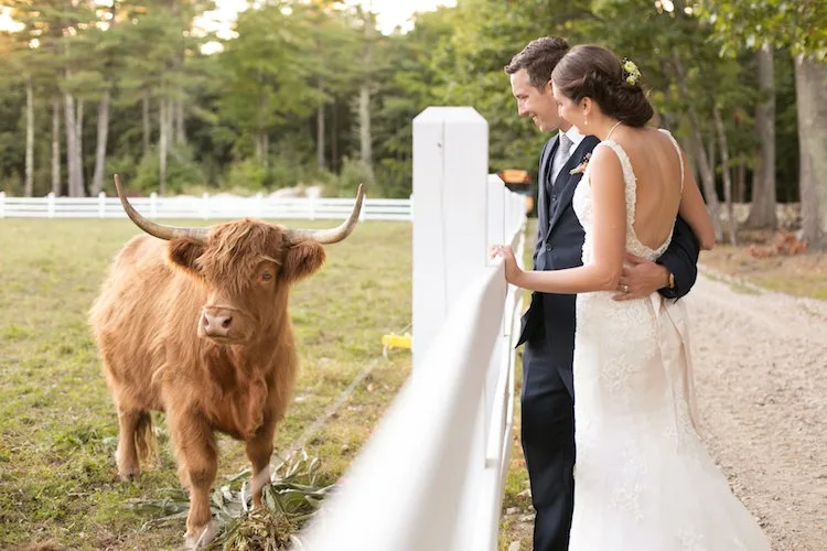 Julia and Chase’s New Hampshire rustic wedding has it all: DIY details, rolling acres, warm barn interiors and even a guest appearance from farmyard friends!